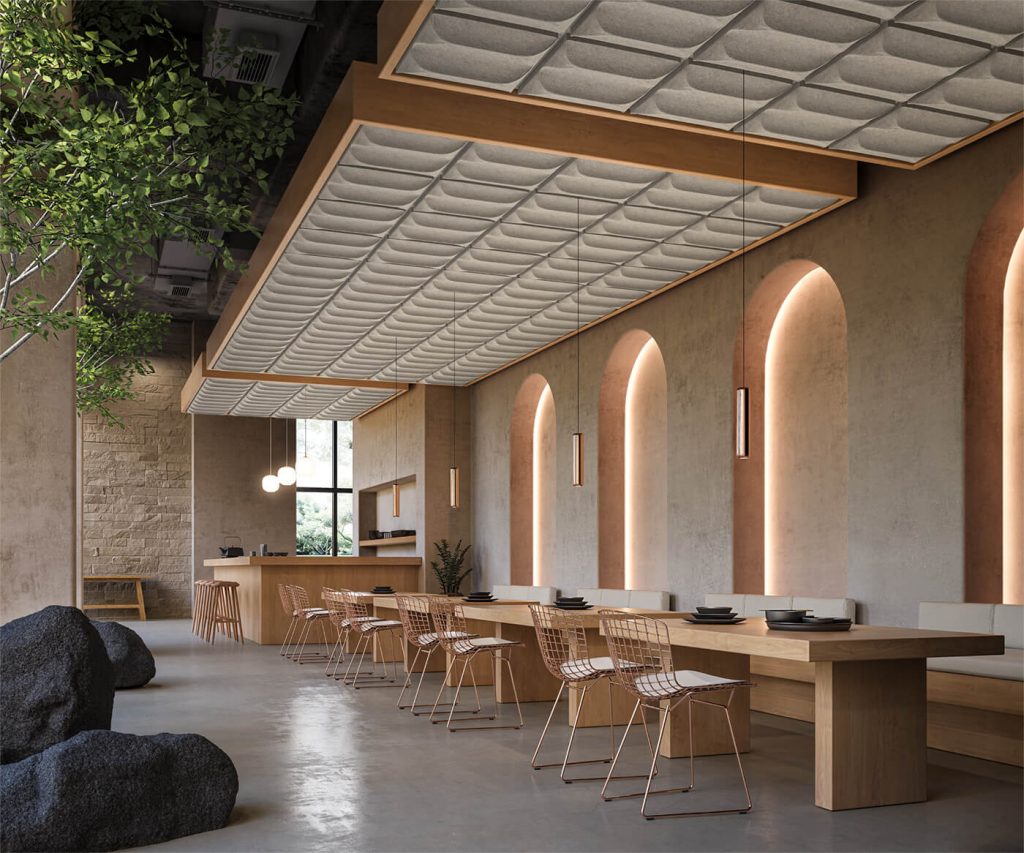 Terra 3D acoustic ceiling tiles evoke calm and balance, inspired by the contemplative rhythm of Zen gardens and terraced landscapes. Shape your biophilic ceiling into a waterfalling, travertine terrace with these Japandi-inspired 3D ceiling tiles.